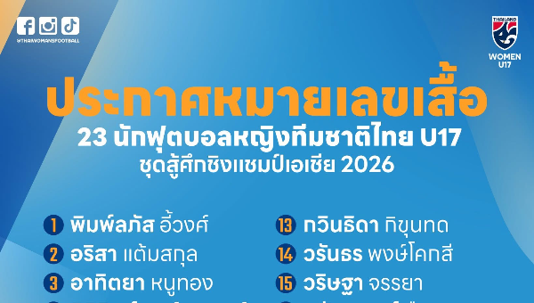 ฟุตบอลหญิงทีมชาติไทย รุ่นอายุไม่เกิน 17 ปี ประกาศหมายเลขเสื้อ นักกีฬาทั้ง 23 คน ที่จะทำการแข่งขันฟุตบอลหญิงชิงแชมป์เอเชีย รุ่นอายุไม่เกิน 17 ปี 2026 (AFC U17 Women's Asian Cup China 2026) ระหว่างวันที่ 1-17 พฤษภาคม 2569 ณ เมืองซูโจว สาธารณรัฐประชาชนจีน ภายใต้การคุมทัพของ "โค้ชมิ่ม" ธิดารัตน์ วิวาสุขุ หัวหน้าผู้ฝึกสอน