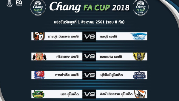 วันที่ 26 กรกฎาคม 2561 เวลา 14.00 น. ณ ห้องราชาวดี สโมสรราชพฤกษ์ สมาคมกีฬาฟุตบอลแห่งประเทศไทยฯ ร่วมกับ บริษัท ช้างอินเตอร์เนชันแนล จำกัด โดยเครื่องดื่มตราช้าง จัดพิธีจับสลากประกบคู่การแข่งขันฟุตบอลช้าง เอฟเอ คัพ รอบ 8 ทีมสุดท้ายขึ้น