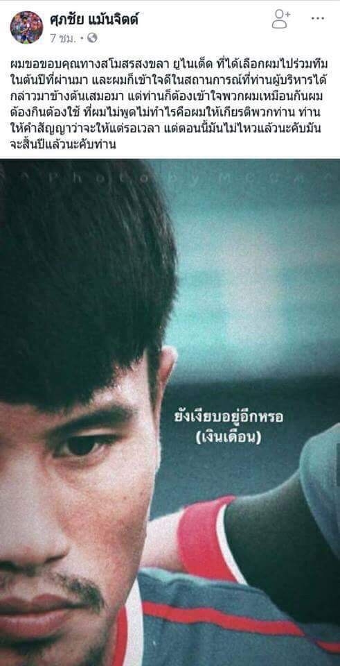 ศุภชัย แม้นจิตต์ นักเตะของสงขลา ยูไนเต็ด ออกมาทวงถามเรื่องเงินเดือนที่ตนยังไม่ได้จากต้นสังกัดผ่านทางเฟซบุ๊กส่วนตัว