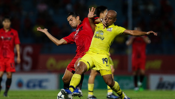 เริ่มเกม 5 นาที พีทีที ระยอง ได้ลุ้นก่อน สหรัฐ กันยะโรจน์ เปิดเตะมุมบอลโค้งมาเข้าศีรษะ เดนนิส มูริลโล่ ได้โขกเน้นๆ แต่บอลหลุดกรอบออกหลัง