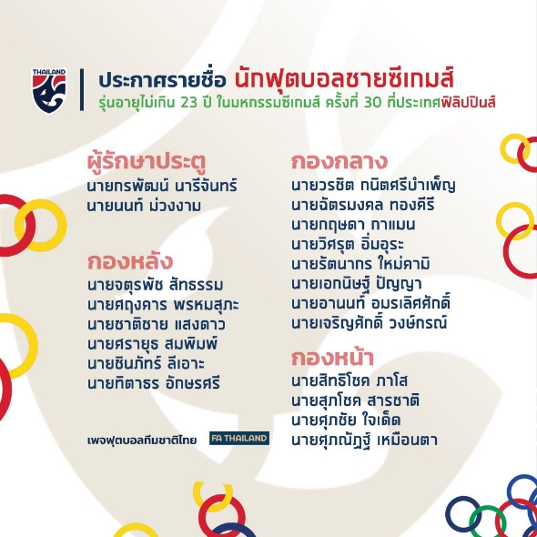 ประกาศรายชื่อ 20 แข้ง ช้างศึก U23 ลุยศึกซีเกมส์ ครั้งที่ 30 ที่ฟิลิปปินส์