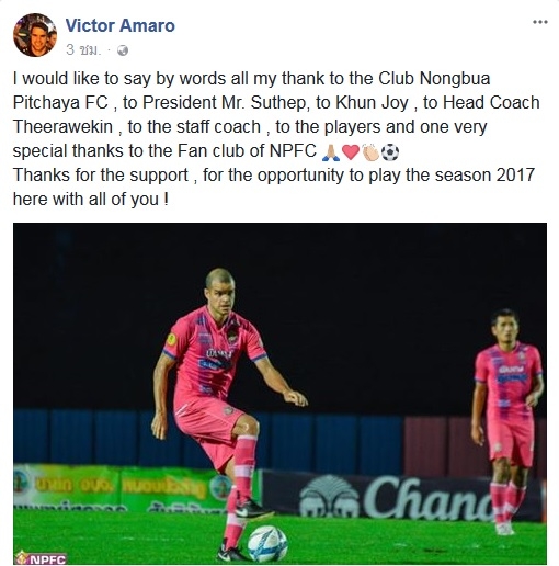 สโมสรหนองบัว พิชญ เอฟซี โพสต์ผ่านเฟสบุ๊กของสโมสร กล่าวขอบคุณ วิคเตอร์ อมาโร่ กองกลางชาวบราซิเลี่ยน ที่หมดสัญญากับทีมเป็นที่เรียบร้อย พร้อมอวยพรให้เจ้าตัวประสบความสำเร็จในอนาคต โดยมีข้อความว่า