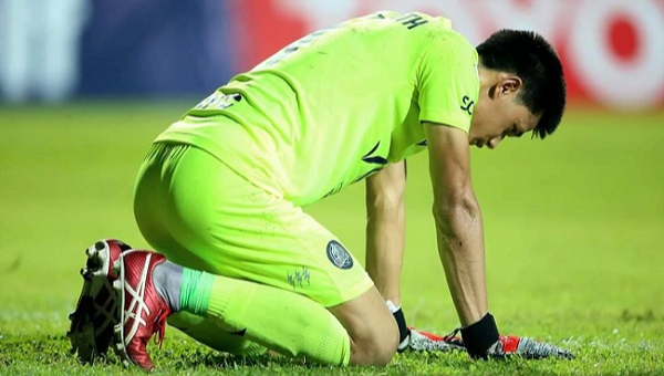 ทศพร ศรีเรือง นายทวารมือ 1 ของ ระยอง เอฟซี ให้กำลังใจ อุดทิลัด นามมะโค้ด ผู้รักษาประตูทีมชาติลาว ที่ทำผิดพลาดถึง 3 ประตูจนทีมแพ้กิเลนผยองขาดลอย