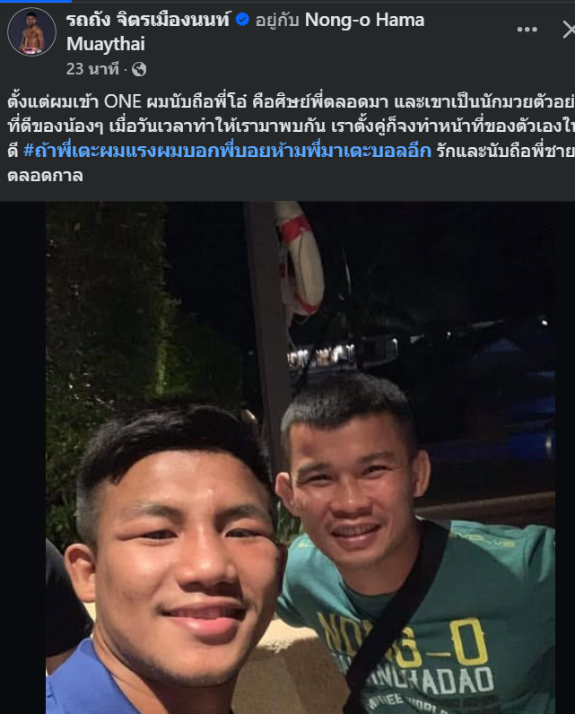 ตั้งแต่ผมเข้า ONE ผมนับถือพี่โอ๋ คือศิษย์พี่ตลอดมา และเขาเป็นนักมวยตัวอย่างที่ดีของน้องๆ เมื่อวันเวลาทำให้เรามาพบกัน เราตั้งคู่ก็จงทำหน้าที่ของตัวเองให้ดี #ถ้าพี่เตะผมแรงผมบอกพี่บอยห้ามพี่มาเตะบอลอีก รักและนับถือพี่ชายตลอดกาล"