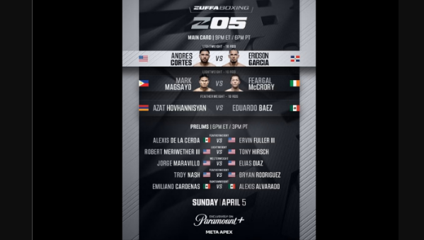 สังเวียนกำปั้นระดับโลกเตรียมลุกเป็นไฟอีกครั้งเมื่อ Zuffa Boxing ประกาศโผคู่มวยในรายการ ZUFFA BOXING 05: CORTES VS. GARCIA ที่เตรียมข้ามฝั่งมาจัดขึ้น ณ เมตา เอเพ็กซ์ ลาสเวกัส ในวันอาทิตย์ที่ 5 เมษายนนี้ตามเวลาท้องถิ่น ไฮไลต์ในช่วงปฐมบทเริ่มด้วย 5 คู่ก่อนรายการที่รวมเหล่านักชกดาวรุ่งไร้พ่ายมาประจันหน้ากัน