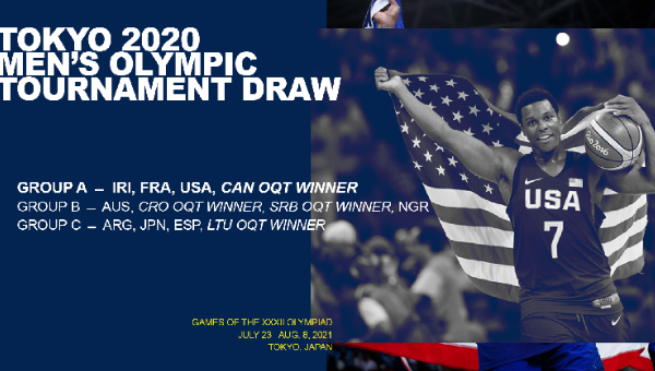 บาสเกตบอลชายทีมชาติสหรัฐฯ วางแผนเตรียมพร้อมสร้างเขตปลอดเชื้อที่ลาส เวกัส ให้ฝึกปรือฝีมือ, ซ้อมแข่งกันเองร่วมกับทีมขาติอออสเตรเลียและสเปน จากนั้นจึงเหินฟ้าสู่ประเทศญี่ปุ่นล่าเหรียญทองอลป.