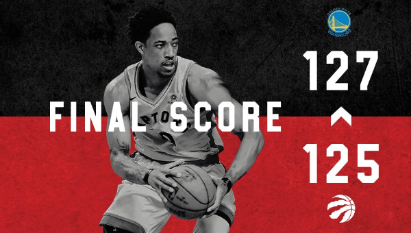 โกลเด้น สเตท วอร์ริเออร์ส เกือบน้ำตาตกเพราะทำแต้มนำ โตรอนโต แรปเตอร์ส มากสุดถึง 27 ทว่ามาเครื่องดับครึ่งหลัง ยังดีที่สามารถประคองตัวเข้าป้ายหืดจับ 127-125 คะแนน ต่อยอดชนะเกมเยือนสิบสองเกมติด