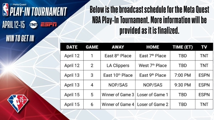 ลีกบาสเกตบอลเอ็นบีเอ เปิดเผยโปรแกรมการแข่งขันเพลย์-อิน ทัวร์นาเมนต์ ออกมาแล้ว โดยจะเริ่มแข่งวันอังคารที่ 12 เม.ย. แล้วไปสะเด็ดน้ำ 15 เม.ย.