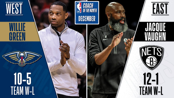 ฌัคก์ วอห์น เฮดโค้ช บรู้กลิน เน็ตส์ และ วิลลี่ กรีน เฮดโค้ช นิว ออร์ลีนส์ เพลิแกนส์ คว้ารางวัลหัวหน้าผู้ฝึกสอนยอดเยี่ยมประจำเดือนธ.ค. 2022 ของคอนเฟอเรนซ์ตัวเอง ตามประกาศจากลีก