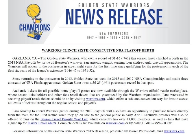 โกลเด้น สเตท วอร์ริเออร์ส เป็นทีมลำดับที่ 4 ของ ลีก บาสเกตบอล ที่คว้าตั๋ว เพลย์ออฟ ฤดูกาล 2017-18 หลังจากมีผลงานทิ้งห่างคู่แข่งในลำดับรองๆมากกว่าจำนวนนัดที่เหลือให้ลงสนาม