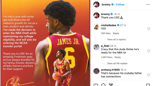 บรอนนี่ เจมส์ ลูกชายคนโตของ เลอบรอน เจมส์ ฟอร์เวิร์ด แอลเอ เลเกอร์ส ได้ประกาศว่าจะเข้ากระบวนการดราฟต์สู่ลีก เอ็นบีเอ คลาส 2024 ขณะเดียวกันก็ยังไม่ทิ้งสิทธิการเล่นระดับคอลเลจไปทันที