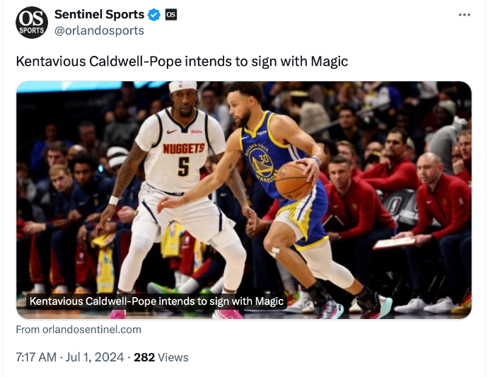 แฟรนไชส์ ออร์แลนโด แมจิค บรรลุข้อตกลงเซ็นสัญญาชู้ตติ้งการ์ดประสบการณ์ เคนทาเวียส คัลด์เวลล์-โพ้พ เป็นเวลา 3 ปีมูลค่า 66 ล้านเหรียญ สหรัฐฯ รอเพียงประกาศทางการ