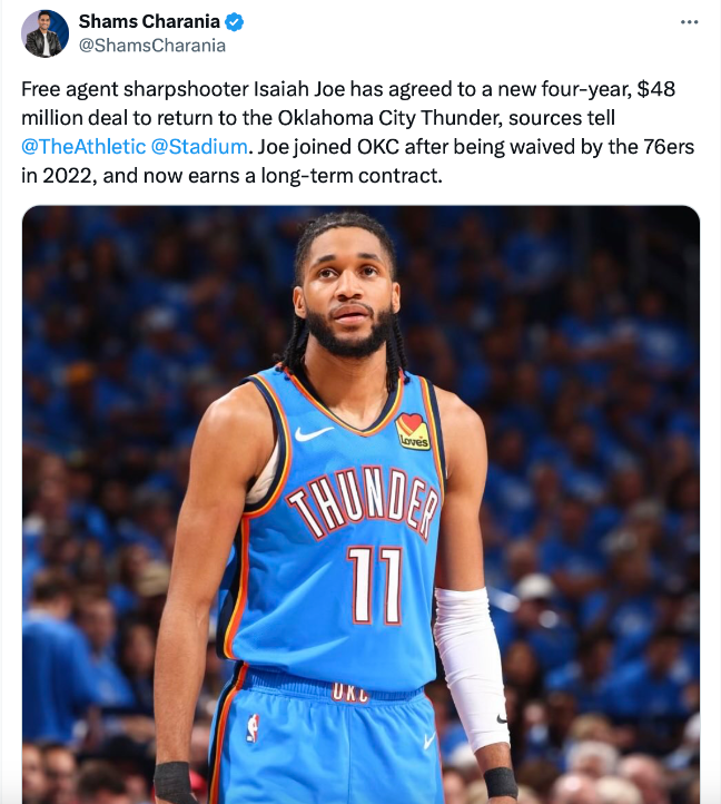 แฟรนไชส์ โอกลาโฮม่า ซิตี้ ธันเดอร์ เลือกฝากความเชื่อมั่นแก่ 2 ผู้เล่นสำรอง ไอเซอาห์ โจ และ แอรอน วิกกิ้นส์ ด้วยสัญญาใหม่ที่จะผูกมัดกันยังเพย์คอม เซนเตอร์ มากกว่า 1 ปีจากนี้
