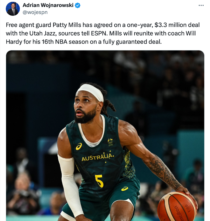 แฟรนไชส์ ยูท่าห์ แจซ บรรลุข้อตกลงเซ็นสัญญาจ้างการ์ดประสบการณ์ แพ็ตตี้ มิลล์ส 1 ปีมูลค่า 3.3 ล้านเหรียญ สหรัฐฯ การันตีทั้งหมด