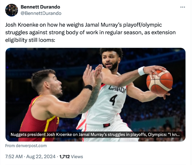 จอช โครเอนกี้ ประธานบริหารแฟรนไชส์ เดนเวอร์ นักเก็ตส์ เข้าใจเหตุที่ จามาล เมอร์รี่ย์ การ์ดตัวเก่งเล่นไม่ออกทั้งในเพลย์ออฟ 2024 หรือ ปารีส อลป.นามทีมชาติแคนาดา ก็เพราะร่างกายไม่สมบูรณ์จนผลงานต่ำมาตรฐาน จากนี้คงไปพักฟื้นให้สมบูรณ์แล้วยอดเพชฌฆาตคนเดิมจะคืนมา