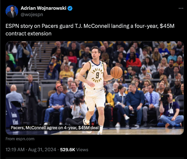 แฟรนไชส์ อินเดียนา เพเซอร์ส บรรลุข้อตกลงต่อสัญญาใหม่แก่การ์ดประสบการณ์ ที.เจ. แม็คคอนเนลล์ อีก 4 ปีมูลค่า 45 ล้านเหรียญ สหรัฐฯ