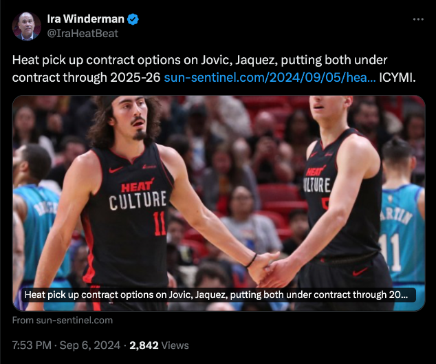 แฟรนไชส์ ไมอามี ฮีต ใช้ออปชั่นทีมในสัญญารุคกี้การันตีจ้างสองผู้เล่นตำแหน่งฟอร์เวิร์ดอย่าง ไฮเม่ ฮาเกซ และ นิโกล่า โยวิช ในฤดูกาล 2025-26