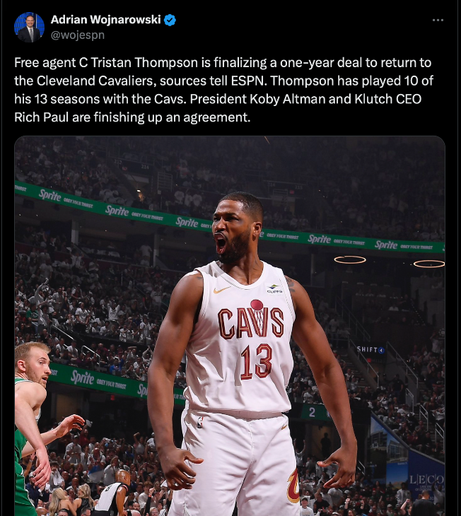 เซนเตอร์ฟรีเอเจนต์ ทริสแทน ธอมป์สัน บรรลุข้อตกลงเซ็นสัญญา 1 ปีเพื่อกลับมาเล่นให้อดีตต้นสังกัด คลีฟแลนด์ แควาเลียร์ส