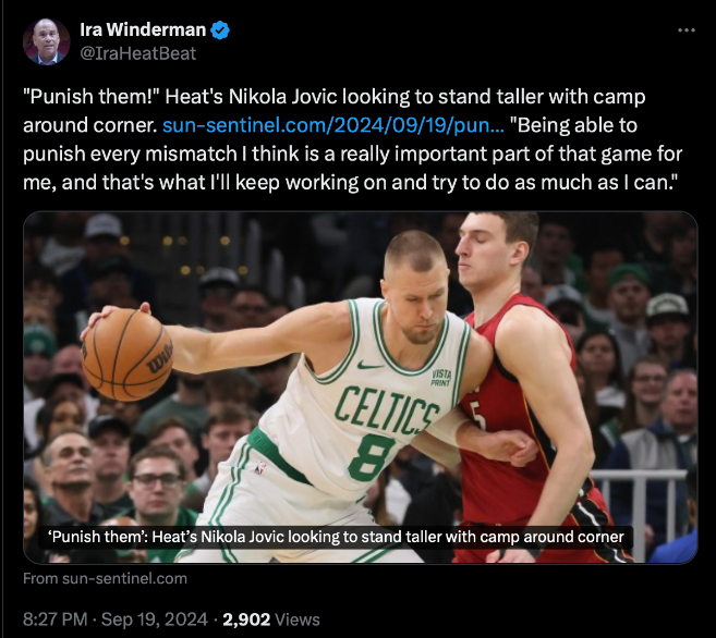 นิโกล่า โยวิช ฟอร์เวิร์ด ไมอามี ฮีต เปิดใจว่าถูกเคี่ยวเข็ญให้ซ้อมการเล่นแบบยืนโพสต์ต่ำ ไม่ค้ำสูงวงในเหมือนที่ผ่านมา นั่นเพราะทีมอยากอาศัยหน่วยก้านที่ได้เปรียบของเขาผสานเข้ากับทักษะ เพื่อเอาชนะตัวประสบที่เสียเปรียบสรีระ
