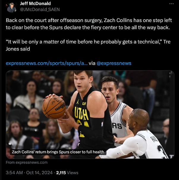 คอลลิ่นส์ ต้องรอถึงการอุ่น่เครื่อง 2024 เกมที่ 3 ทางเฮดโค้ช เกร็กก์ โพโพวิช ถึงกล้าส่งลงแข่งเพราะเห็นว่าเนื้อฟื้นสมบูรณ์จริงๆจากการผ่าไหล่ขวาตลอดหลายเดือนที่ผ่านมา