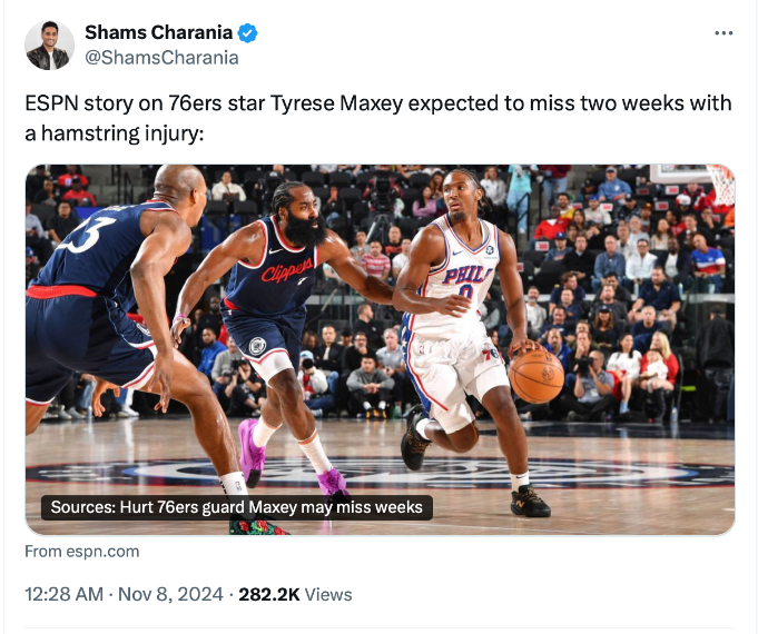 ไทรีส แม็กซี่ย์ การ์ด ฟิลาเดลเฟีย 76เซอร์ส คาดว่าจะพลาดลงสนามให้ต้นสังกัดไปอีกครึ่งเดือนจากนี้เพราะบาดเจ็บกล้ามเนื้อต้นขาด้านหลังข้างขวา