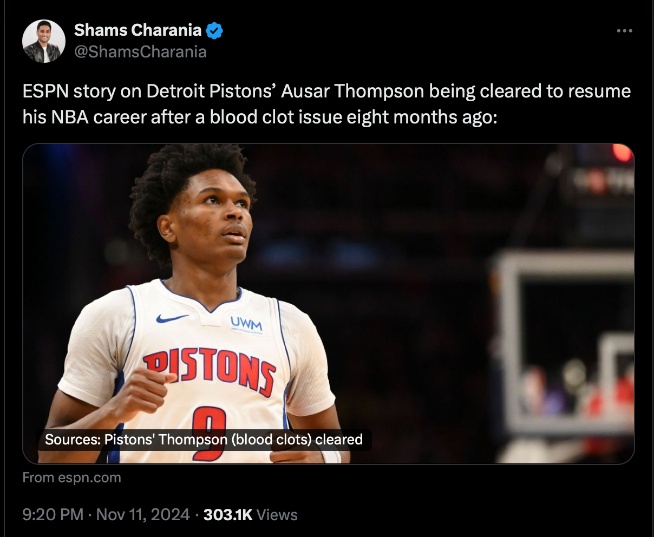 รายงานจาก ‘อีเอสพีเอ็น’ว่าดราฟต์ลำดับ 5 คลาส 2023 โดยเขาพลาดลงสนามมาตั้งแต่มี.ค.เพราะลิ่มเลือดอุดตัน จนพลาด 19 เกมส่งท้ายซีซั่นก่อน ทั้งรอการประเดิมฤดูกาล 2024-25 อยู่