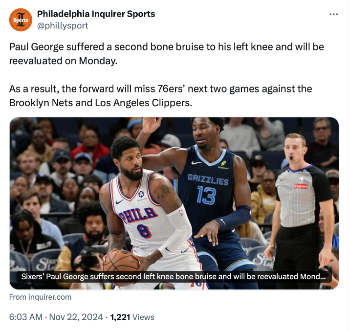 พอล จอร์จ ปีก ฟิลาเดลเฟีย 76เซอร์ส บาดเจ็บเข่าซ้ายเหยียด แนวทางรักษาคือพักฟื้นในอีกสองเกมจากนี้ แล้วค่อยติดตามอาการอีกที