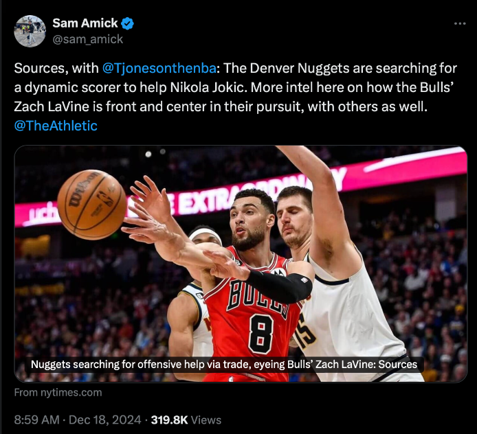 แฟรนไชส์ เดนเวอร์ นักเก็ตส์ พร้อมเสริมประสิทธิภาพเกมบุกโดยมีเป้าหมายสำคัญคือการเทรดชู้ตติ้งการ์ด แซ็ค ลาวีน จาก ชิคาโก บูลล์ส