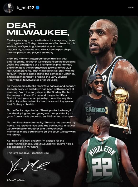 'ตั้งแต่วินาทีที่ผมก้าวเข้ามาในเมืองนี้ พวกคุณก็โอบกอดผม' มิดเดิลตัน โพสต์ข้อความลงบัญชี X 'เรามีประสบการณ์ร่วมกันในการสร้างเมืองใหม่ การก้าวขึ้นมาเป็นผู้ท้าชิงแชมป์ และในท้ายที่สุด การเดินทางที่ไม่มีวันลืมเลือนสู่การคว้าแชมป์เอ็นบีเอในปี 2021 ช่วงเวลาอันมหัศจรรย์นั้นจะอยู่กับผมตลอดไป'