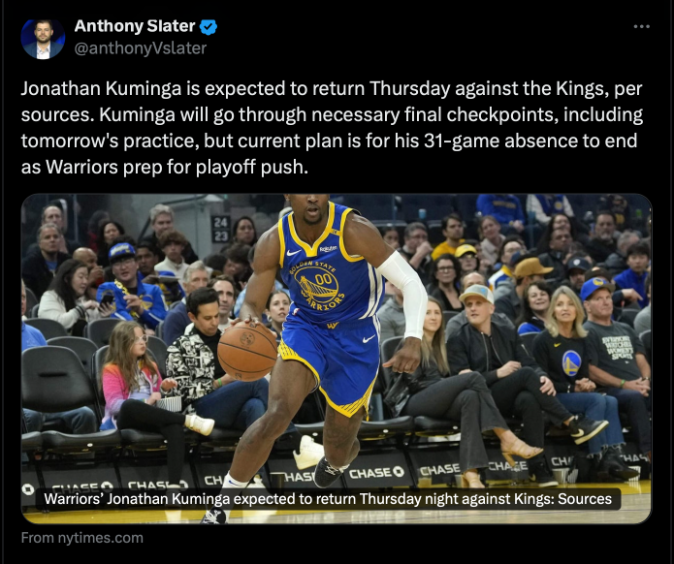 โจนาธาน คูมินก้า ฟอร์เวิร์ด โกลเด้น สเตต วอร์ริเออร์ส ถูกคาดหมายว่าจะพร้อมกลับมาเล่นให้ทีมอีกครั้งพฤหัสบดีนี้พบ แซคราเมนโต คิงส์ (13 มี.ค.)เมื่อฟื้นเจ็บข้อเท้าแพลง