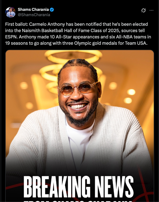 คาร์เมโล่ แอนโธนี่ อดีตฟอร์เวิร์ด นิวยอร์ก นิคส์ และ มหาวิทยาลัย เซียราคิวส์ คาดว่าจะถูกคัดเลือกเข้าเนสมิธ ฮอลล์ ออฟ เฟม คลาส 2025 นี้
