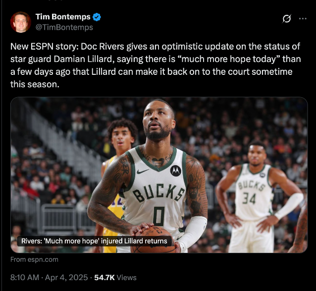 ด็อค ริเวอร์ส เฮดโค้ช มิลวอคกี บัคส์ ยังมองโลกในแง่ดีขอแค่ทีมผ่านเข้ารอบเพลย์ออฟ 2025 ไปให้ได้ลึกที่สุด ก็พอซื้อเวลารอการ์ดจ่าย เดเมี่ยน ลิลเลิร์ด ฟื้นจากภาวะลิ่มเลือดอุดตันกลับมาช่วยทีมช่วงสำคัญ