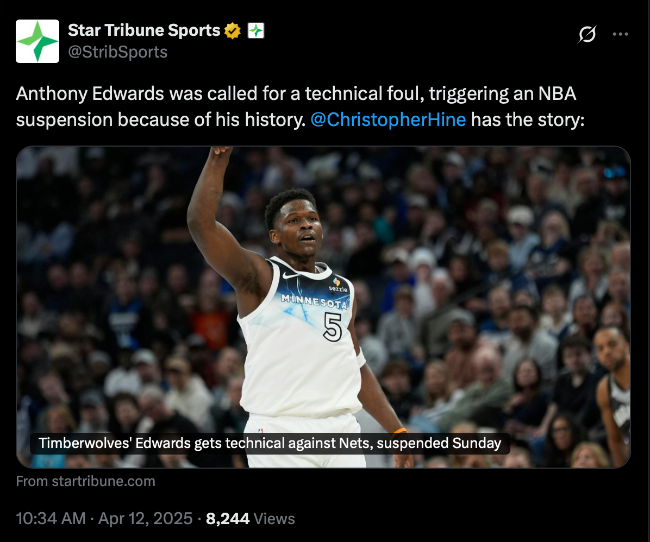 แอนโธนี่ เอ็ดเวิร์ดส์ ปีก มินเนโซตา ทิมเบอร์วูล์ฟส์ สะสมฟาวล์เทคนิค 18 ครั้งในฤดูกาลปกติ 2024-25 ส่งผลให้ต้องพลาดเกมสำคัญส่งท้ายซีซั่นที่ต้องชนะเพื่อแย่งตั๋วเพลย์ออฟ อัตโนมัติ
