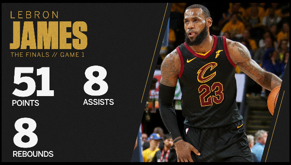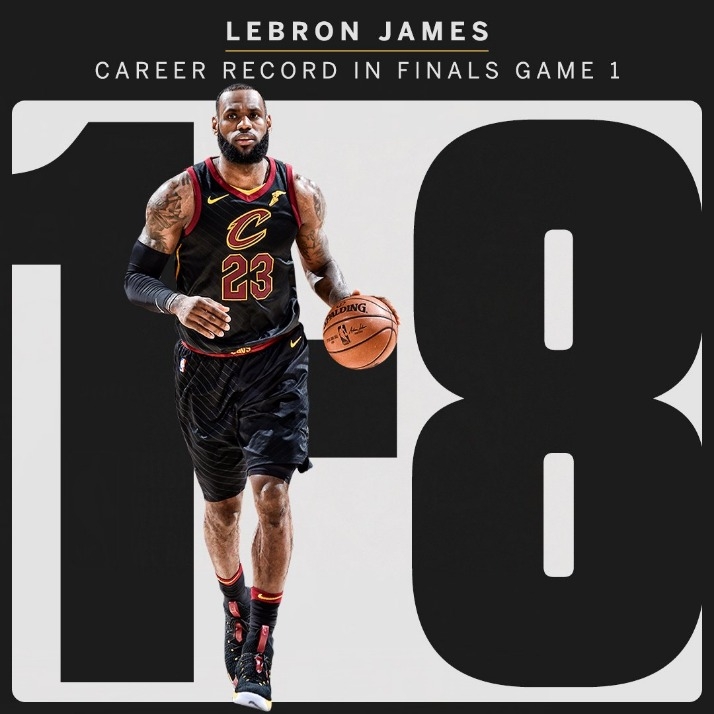 เลอบรอน เจมส์ ฟอร์เวิร์ด คลีฟแลนด์ คาวาเลียร์ส สร้างอีกหนึ่งสถิติทาบชั้นผู้เล่นตำนานอย่าง ไมเคิ่ล จอร์แดน เมื่อสกอร์อย่างน้อย 30 แต้ม/นัด ในเพลย์ออฟเป็นหนที่ 109 มากสุดตลอดกาลร่วม หลังจบเกมพ่ายOT ต่อ โกลเด้น สเตท วอร์ริเออร์ส 114-124 คะแนน