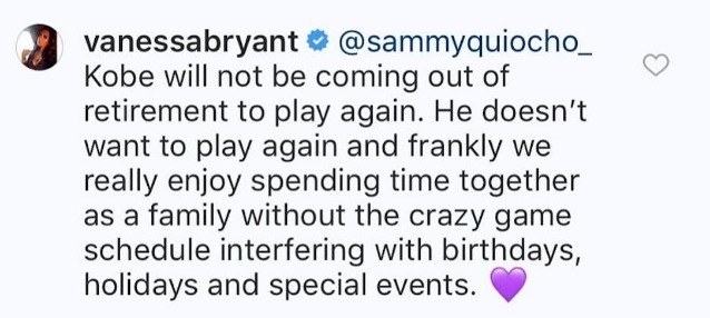 วาเนสซ่า ไบรอันท์ ภรรยาคนสวยของ โคบี้ ไบรอันท์ ยืนยันผ่านอินสตาแกรมส่วนตัวว่าเจ้าสำนัก งูดำ ไม่กลับมาเล่นเอ็นบีเอ อีกแล้ว กรุณาอย่าเชื่อข่าวลือหรือเรื่องปั้นแต่ง