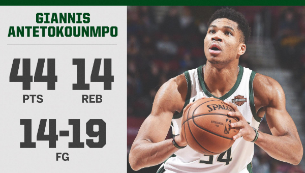 เจ้าของฉายา 'กรีกฟรี้ก' กดไป 44 แต้ม ทาบผลงานดีสุดอาชีพ จากฟิลด์โกล 14 ใน 19 หน, ลูกโทษอีก 16 บวกรีบาวน์ด 14 ครั้งและแปดแอสซิสต์ แก้ตัวจากวานนี้ที่ได้เพียง 12 คะแนน แมตช์พ่าย อินเดียนา เพเซอร์ส