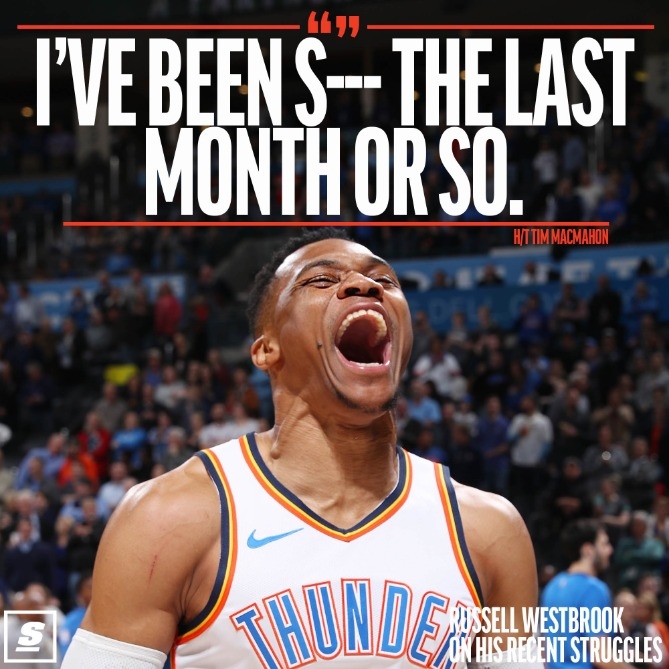 'รัสส์' ฟอร์มโบว์ดำในเดือนส่งท้ายปี 2018 ฟิลด์โกลแค่ 38.9% ขณะที่ลูกยิง 3-คะแนน ก็เลอะเทอะ 29.7% เท่านั้น โดยมันตอกย้ำในเกมพบ 'แมฟส์' ที่ส่องลงแค่ 4 จากโอกาส 22 ครั้ง