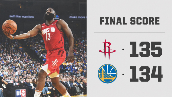 เจมส์ ฮาร์เด้น การ์ดตัวเก่ง ฮิวสตัน ร็อคเก็ตส์ ยิงไกลตอนเหลือเวลา 2.7 วินาที ของช่วงโอเวอร์ไทม์ ส่งต้นสังกัดเชือด โกลเด้น สเตท วอร์ริเออร์ส ระทึก 135-134 คะแนน กำชัยหกนัดติด