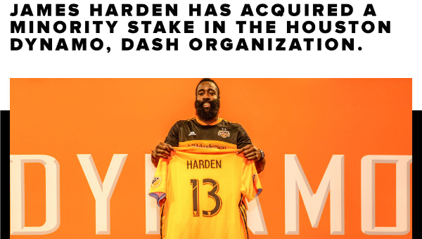 เจมส์ ฮาร์เด้น ซูเปอร์สตาร์บาสเกตบอล เอ็นบีเอ สังกัด ฮิวสตัน ร็อคเก็ตส์ ร่วมลงทุนเข้าหุ้นเล็กกับกลุ่มนักบริหาร เพื่อร่วมเป็นเจ้าของกิจการทีม เมเจอร์ลีก ซอคเก้อร์ ฮิวสตัน ไดนาโม, ทีมสตรี ฮิวสตัน แดช และสิทธิ์บนสนามแข่ง บีบีวีเอ สเตเดี้ยม รังเหย้าของพวกเขา
