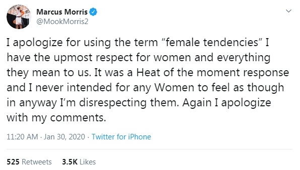 มาร์คัส มอร์ริส ฟอร์เวิร์ด นิวยอร์ก นิคส์ ทวีตขอโทษหลังสัมภาษณ์ด่า เจ คราวเดอร์ ผู้เล่น เมมฟิส กริซซ์ลี่ส์ ว่าเป็นไอ้หน้าตัวเมีย โดยชี้ว่าไม่มีเจตนาเหยียดสตรีเพศ เพียงต้องการตำหนิพฤติกรรมของฟอร์เวิร์ดไร้มารยาทว่าไม่เป็นสุภาพบุรุษ