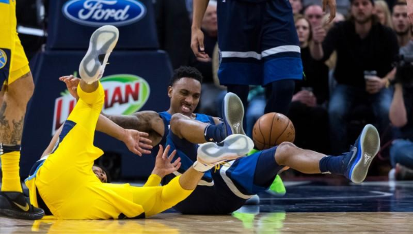 เจฟฟ์ ทีก (ขวา) พอยน์การ์ดทิมเบอร์วูล์ฟส์เสียหลักล้มลงกองบนคอร์ตหลังแย่งบอลกับ แกรี่ แฮร์ริส การ์ดนักเก็ตส์จนมีอาการเจ็บเข่าซ้ายและต้องรอผลสแกนว่าอาการหนักมากน้อยเพียงใดในวันพฤหัสฯ