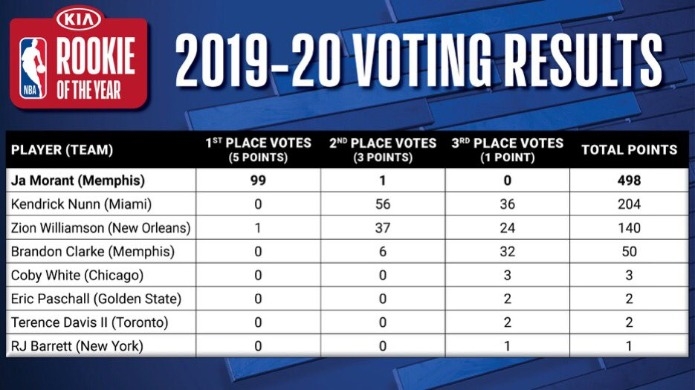 99 จาก 100 เสียงโหวตจากผู้สื่อข่าวสายบาสฯ และผู้สันทัดกรณีให้ โมแรนท์ มาในโหวตลำดับแรก คะแนนรวมกดไป 498 แต้ม ตามด้วย เคนดรี้ค นันน์ การ์ด ไมอามี ฮีต ( 204 แต้ม) และ ไซออน วิลเลียมสัน ฟอร์เวิร์ด นิว ออร์ลีนส์ เพลิแกนส์ ( 104 แต้ม)