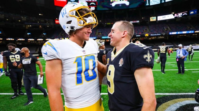 ดรูว์ บรีส์ อดีตควอร์เตอร์แบ็ก นิว ออร์ลีนส์ เซนต์ส ระหว่างการเยี่ยมชมแคมป์ฝึกซ้อมของ แอลเอ ชาร์จเจอร์ส ทีมแรกของเขาพร้อมกล่าวชื่นชม จัสติน เฮอร์เบิร์ต ว่าเป็นควอร์เตอร์แบ็กแห่งอนาคต