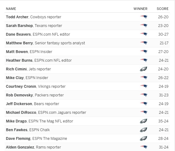 ปรากฎว่าเสียงส่วนใหญ่เทใจให้ นิว อิงแลนด์ มากถึง 40 ราย คนเด่นๆก็อย่าง แดน บีเวอร์ส บก.ใหญ่, หลุยส์ ริดดิ้ค ผู้วิเคราะห์สถิติ หรือ ฟิลด์ เยตส์ อีเอสพีเอ็น อินไซเดอร์
