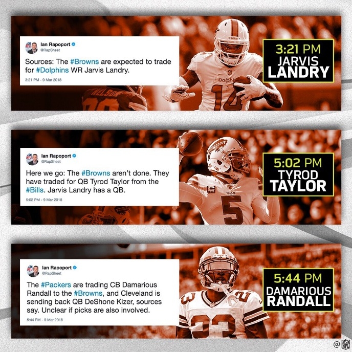 รายงานจาก 'เอ็นเอฟแอล อินไซเดอร์' ระบุว่าดีลของ คลีฟแลนด์ เริ่มตั้งแต่ช่วง 15:21 น.ตามเวลาท้องถิ่น เริ่มด้วย เทรด จาร์วิส แลนดรี้ ปีกนอกจาก ไมอามี ดอลฟินส์ แลกด้วยสองสิทธิดราฟต์(หนนึงปีนี้ หนนึงปีหน้า แต่ไม่แพงกว่ารอบสาม)