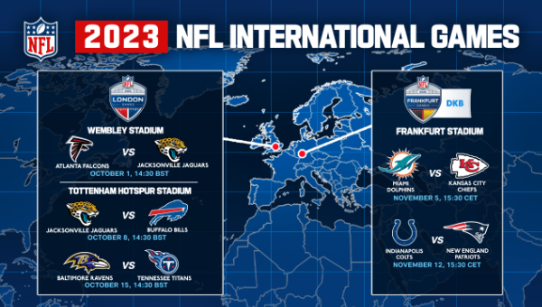 ลีกเอ็นเอฟแอลได้ประกาศคู่แข่งขัน, วันที่ และสถานที่สำหรับการแข่งขันนอกประเทศ 5 เกมในซีซั่น 2023 ที่กรุงลอนดอน ประเทศอังกฤษ 3 เกม และอีก 2 เกมที่แฟร้งค์เฟิร์ต ประเทศเยอรมนี ตามรายงานจากเอ็นเอฟแอลเน็ตเวิร์คเมื่อวันพุธที่ผ่านมา