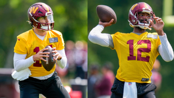แซม ฮาวเวลล์ (ซ้าย) ยังต้องต่อสู้กับ เจโคบี้ บริสเซ็ตต์ (ขวา) เพื่อแย่งชิงตำแหน่งควอร์เตอร์แบ็กตัวจริงของ วอชิงตัน คอมแมนเดอร์ส ในซีซั่น 2023