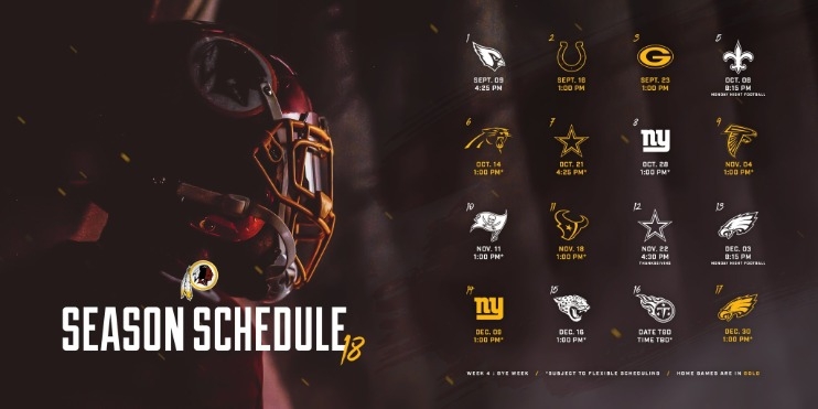 อนึ่งโปรแกรมฤดูกาล 2018 ของ วอชิงตัน จัดว่าสุดโหด นอกจากอยู่ในกลุ่ม เอ็นเอฟซี ตะวันออกที่ยากแล้ว ปีนี้ต้องยกดิวิชั่นเจอพวก เอ็นเอฟซี ใต้, มีเปิดบ้านรับ กรีน เบย์ แพ็คเกอร์ส หรือกระทั่งยกกลุ่มเจอ เอเอฟซี ใต้ ที่กำลังฟอร์มพุ่งหลายแฟรนไชส์