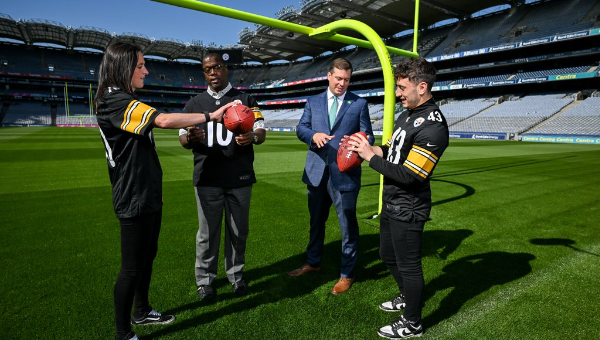 แดน รูนี่ย์ (สวมสูท) หนึ่งในครอบครัวเจ้าของทีม พิตต์สเบิร์ก สตีลเลอร์ส พยายามผลักดันเกมเอ็นเอฟแอลมาแข่งขันกันที่ไอร์แลนด์ในอนาคต