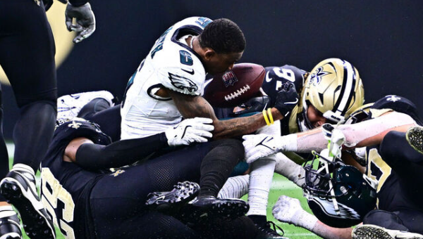 เดวอนเท สมิธ ปีกนอก ฟิลาเดลเฟีย อีเกิ้ลส์ ถูกผู้เล่นเกมป้องกันของ นิว ออร์ลีนส์ เซนต์ส รุมแท็คเกิ้ลจนบาดเจ็บศรีษะเมื่อวันอาทิตย์